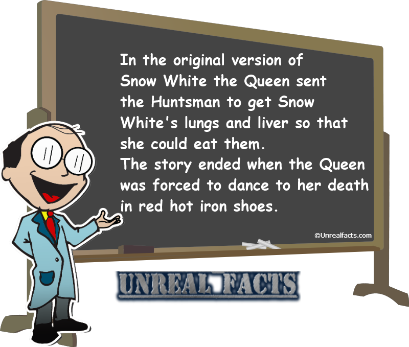 Now the original Snow White story isn’t really all that different from the version that Disney presented us. Where there is a difference is that the Queen actually asked for Snow Whites lungs and liver to be served for dinner that night, not her heart to be brought to her. So yeah, she was going to chow down on a little offal, courtesy of Snow White. Cannibalism anyone?
